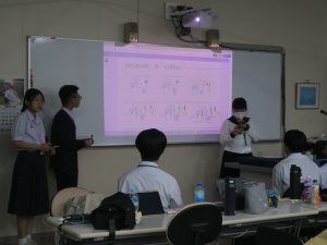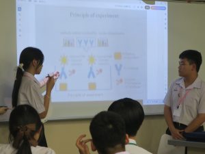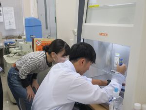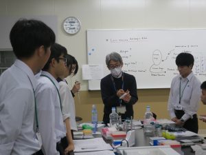 メインテーマは「より安全な未来を創造しよう!」で、各班はそれぞれの実験テーマに沿って生命医科学科の先生方の下で、それぞれ実験を開始。説明はすべて英語で行い、最後はパワーポイントにまとめて英語で発表を行いました。本学の学生も一緒に実験に入りサポートをしてくれました。
