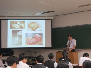 まず学校全体の説明を聞いた後、スポーツ健康福祉学科 佐々木 さはら 講師の講義「正しいケガの予防法~トレーナーの目線から~」を受講。お昼は食堂にて学食体験を。広い食堂と大学の雰囲気を楽しんでくれているようでした。午後からは動物生命薬学科 片本 宏 教授の講義「牛と「ゲップ」と地球温暖化」を受講しました。先生方の講義は大変興味深い内容で、生徒さんたちは真剣に話を聴いていました。