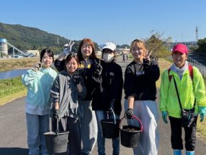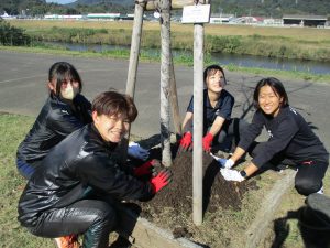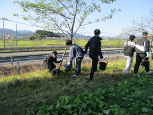 11月15日(土)学生40名が五ヶ瀬川堤防(コノハナロード)にて【天下一ひむか桜】の根回りに施肥をするボランティア活動に参加しました。