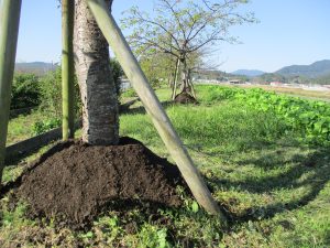 バケツに腐葉土を入れる→バケツを運搬する→根回りに盛り土をする、これらの作業を分担して行いました。