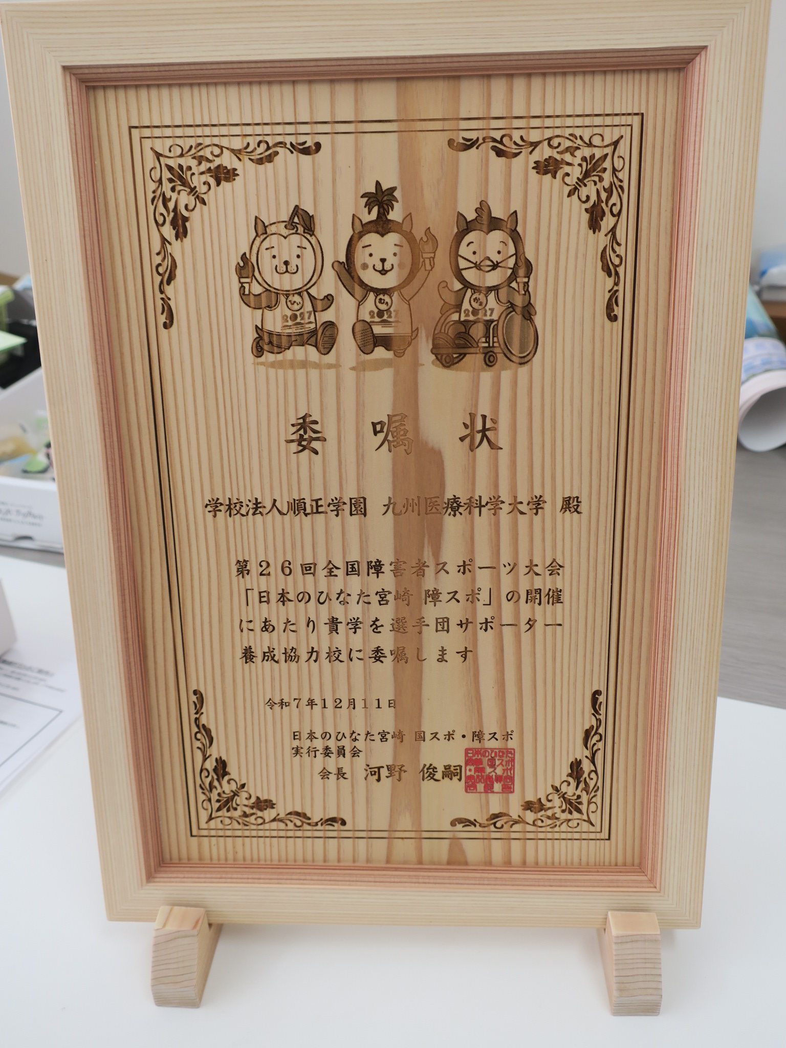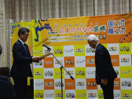 2027年に宮崎県で開催される第26回全国障害者スポーツ大会「日本のひなた宮崎 障スポ」に向け、の選手団サポーター養成協力校(県内の医療・福祉系の大学や専門学校など18校)への委嘱状交付式が行われました。本学からは池ノ上学長が出席し、委嘱状の交付を受けました。