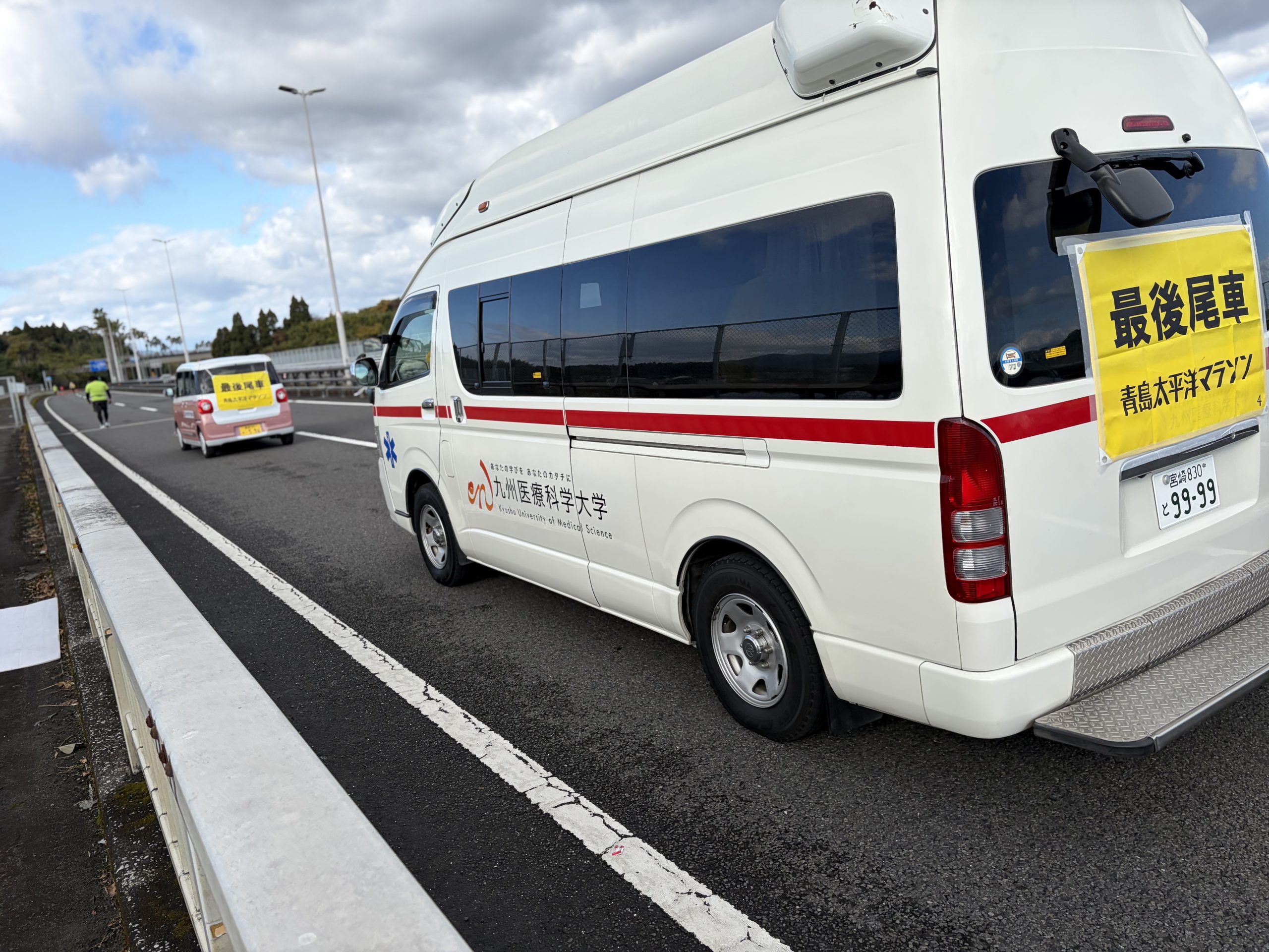 - 実習用救急車による後方支援 本学所有の実習用救急車が大会の最後尾車両として伴走。コース全体を見守りながら、緊急時の迅速な対応を可能にする後方支援体制を構築しました。
