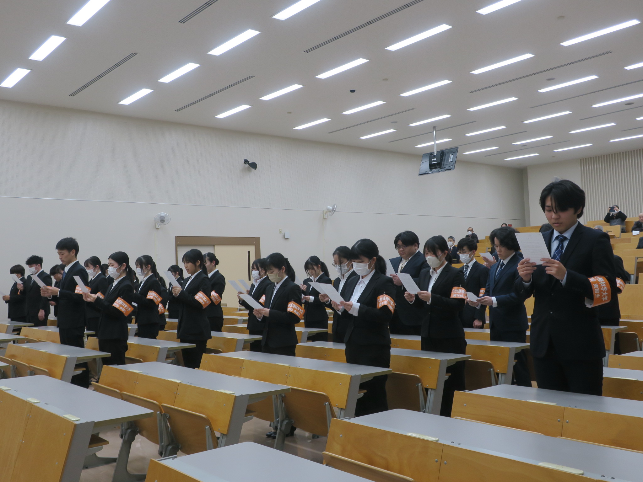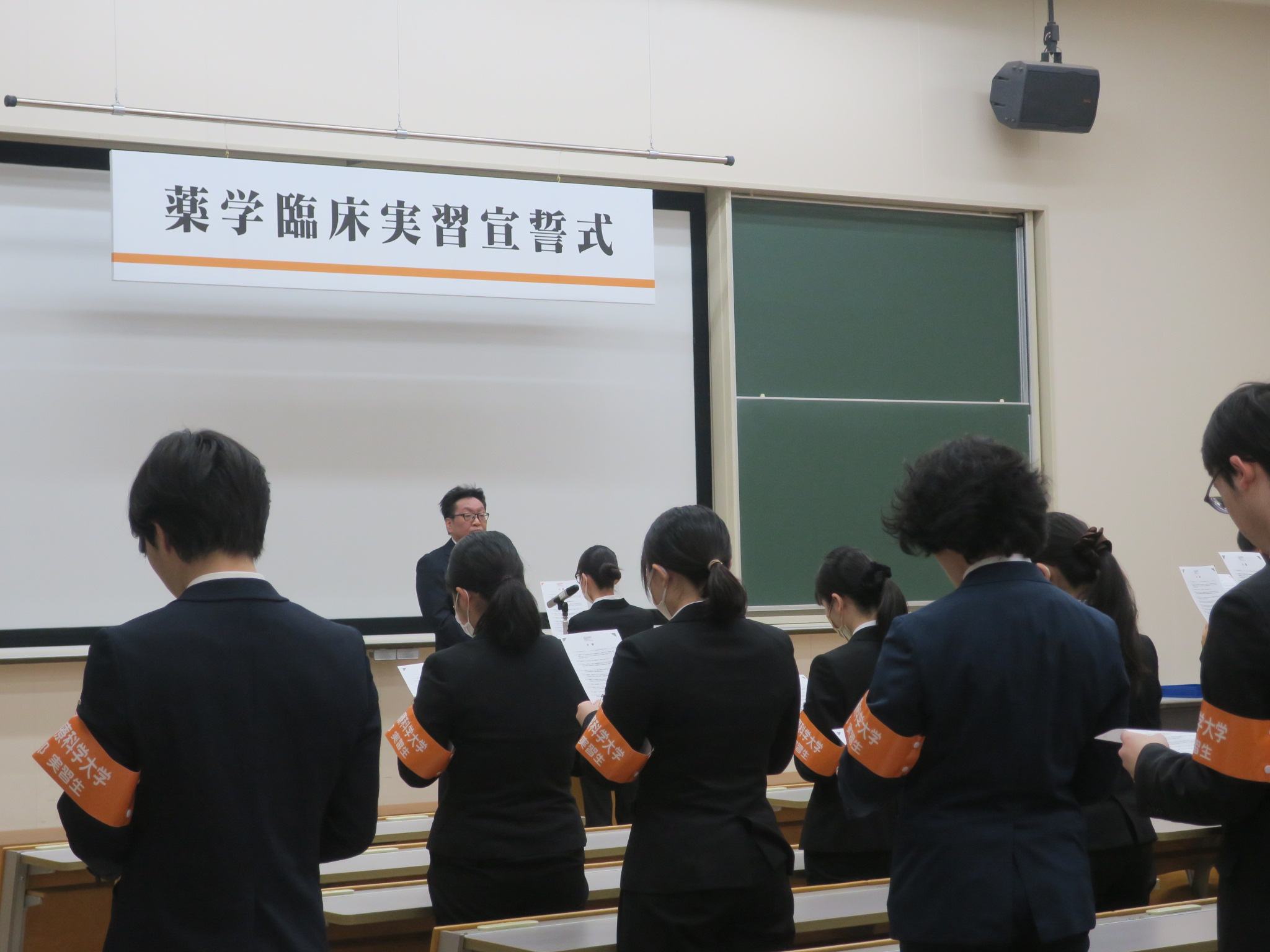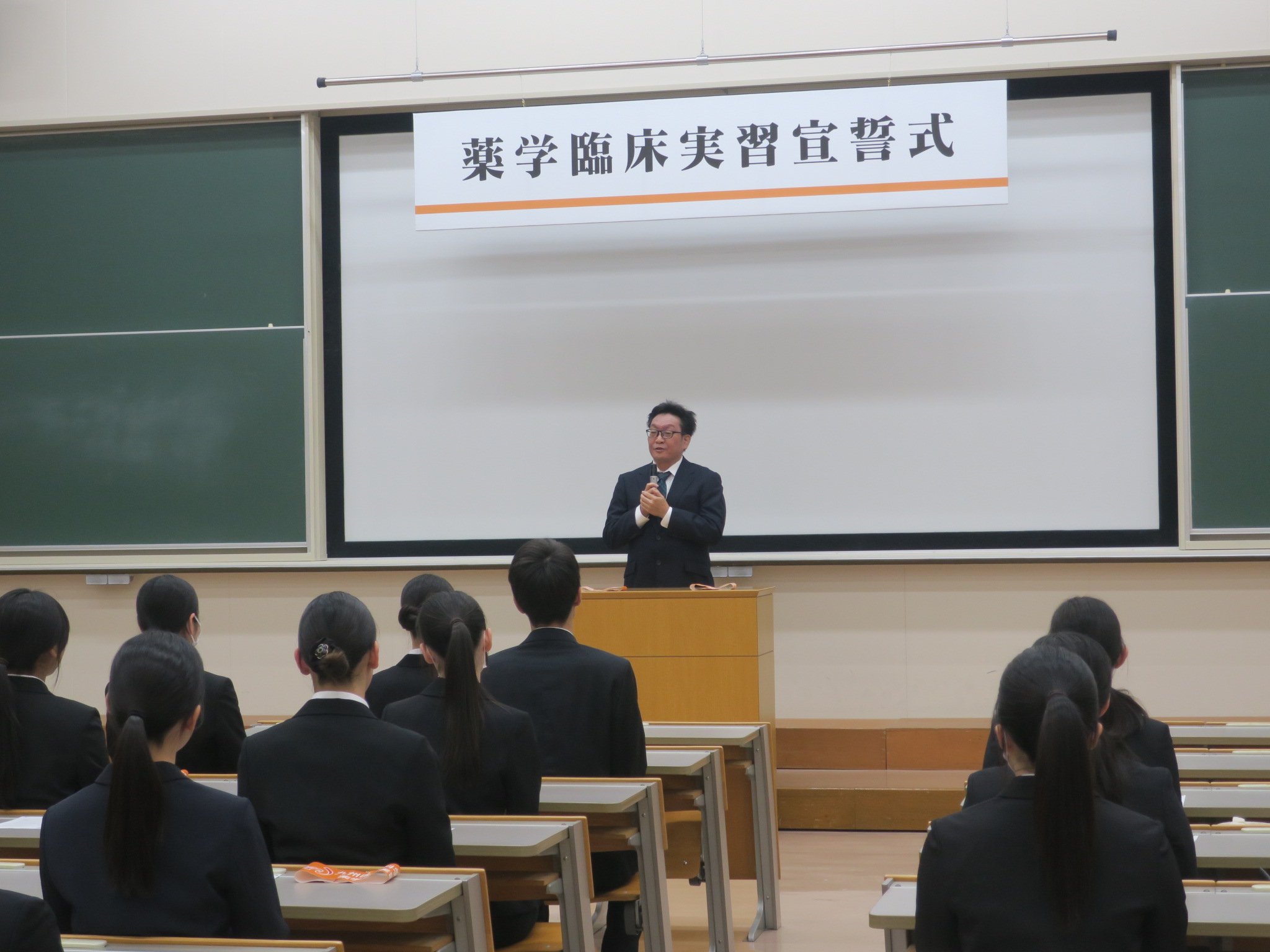 2026年01月29日 お知らせ 薬学臨床実習宣誓式を行いました。 薬学臨床実習宣誓式を行いました。 1月29日(木)15:10~薬学臨床実習宣誓式を行いました。 この式は、4年次から5年次に22週間に渡って実施される実務実習において、各人が本学の名を背負って各医療施設(薬局・病院)で実務実習を一生懸命にやり遂げて参りますという誓いをたてるとともに、一人ひとりに「九州医療科学大学・薬学部・実習生」と書かれた腕章を授与するものです。 2月16日より始まる実務実習に向けて、薬剤師倫理規定を拝読しました。