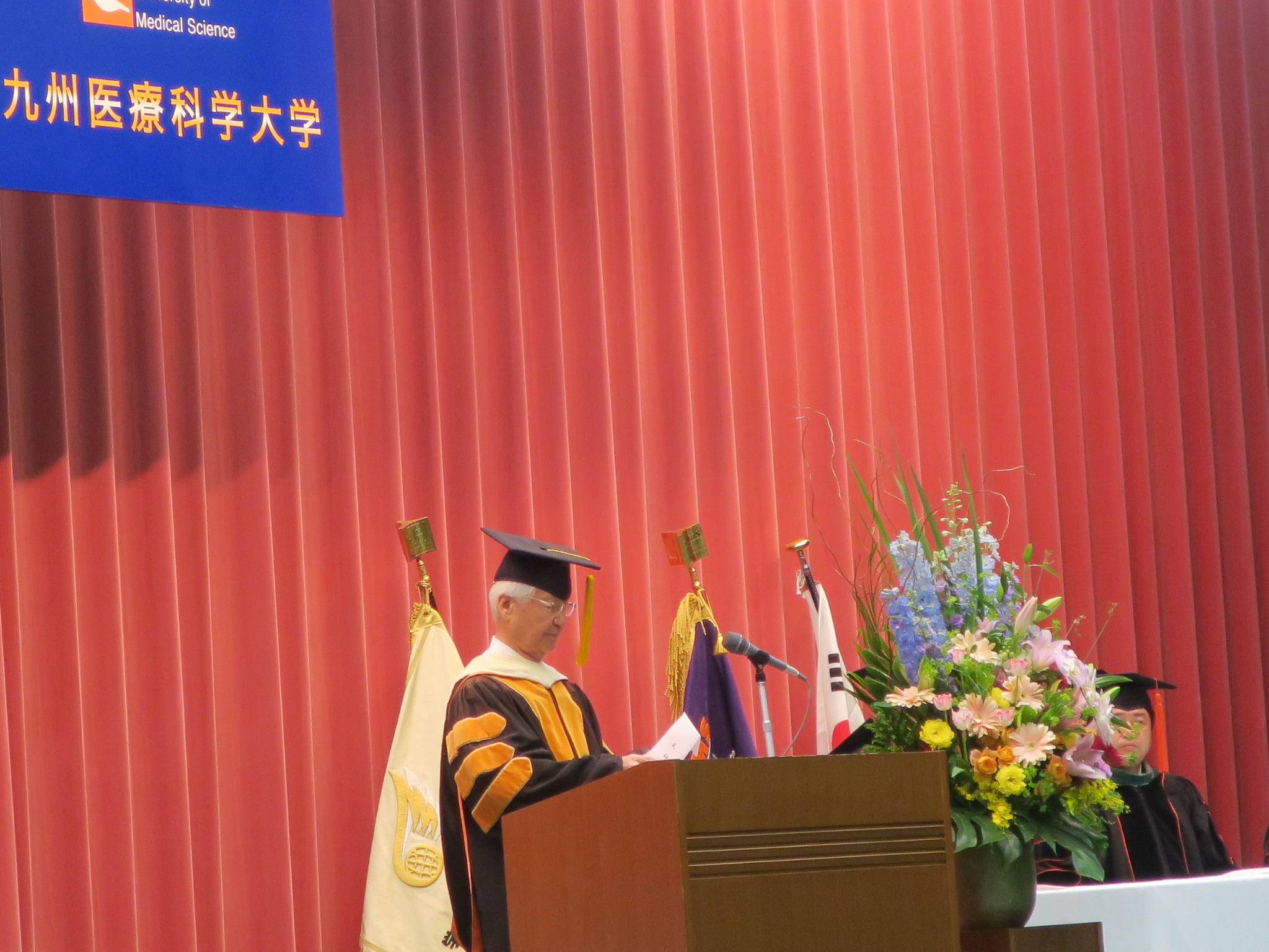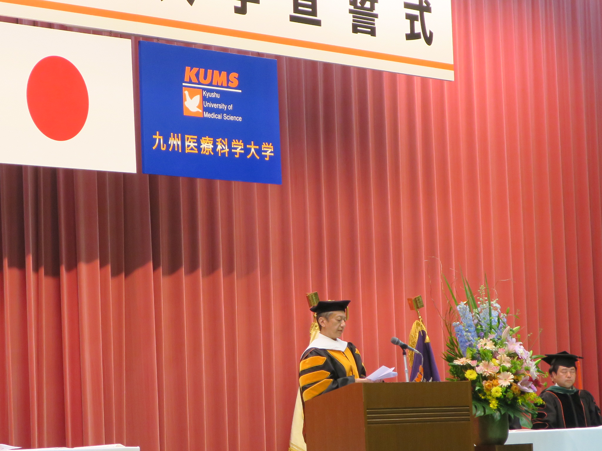 「九州医療科学大学の建学の理念を十分理解し、学則を守り、時代の変革に対応できる広い視野と、豊かな創造力、そして専門的な知識と能力を身につけるとともに、九州医療科学大学の学生としての誇りと自覚をもって、医療、福祉ならびに地域社会において人びとの幸せを創り出すことのできる人材となるよう努力することを誓います」と宣誓しました。