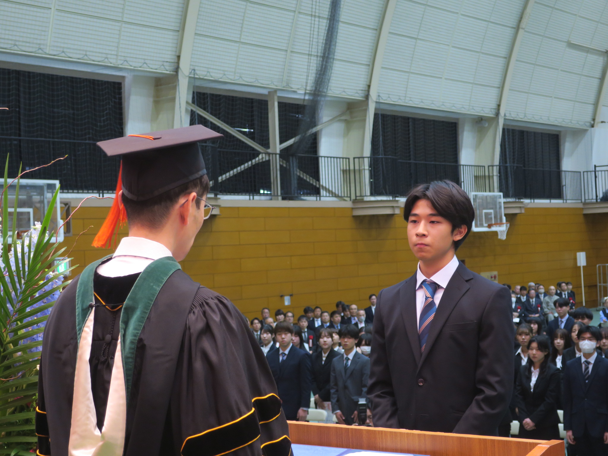 続いて、学生支援の一環として延岡市内の店舗で使える『のべおかcoin』が延岡市より学部入学生全員に贈呈され、新入生代表で生命医科学部 生命医科学科 伊佐 慈安さんが三浦延岡市長より受け取りました。